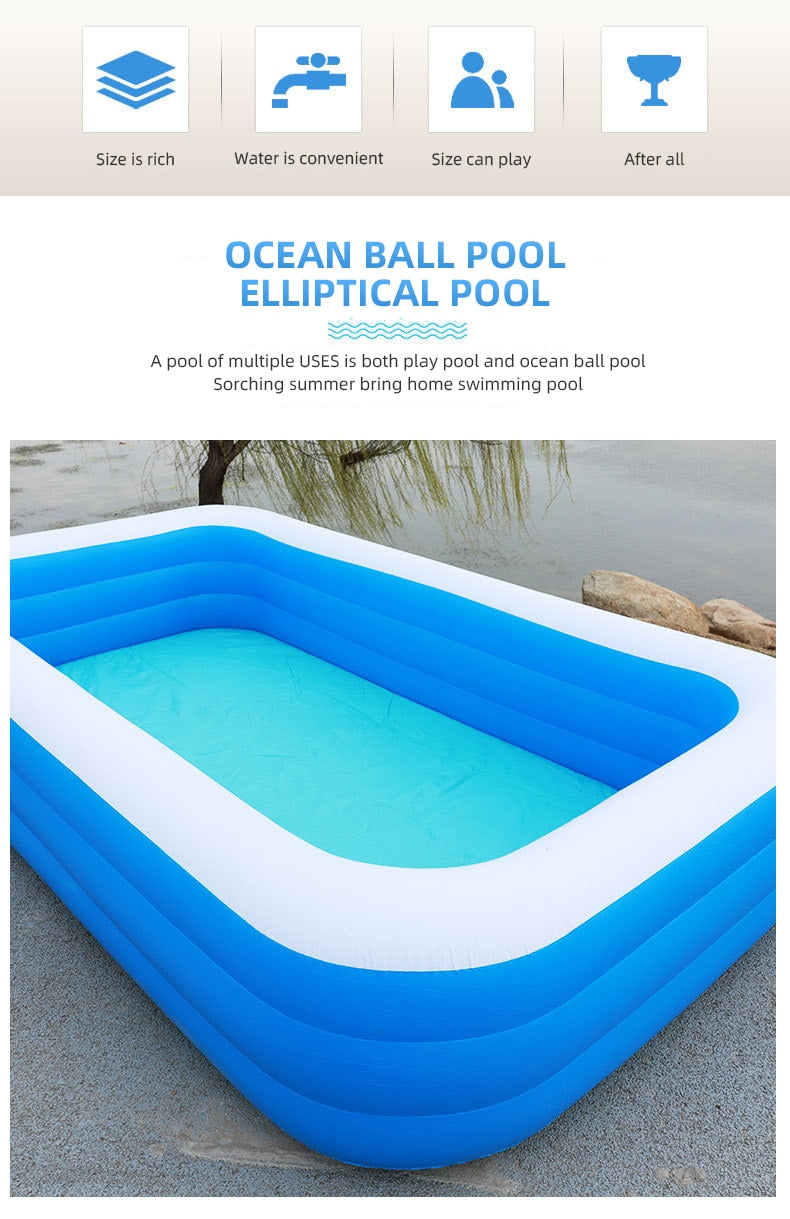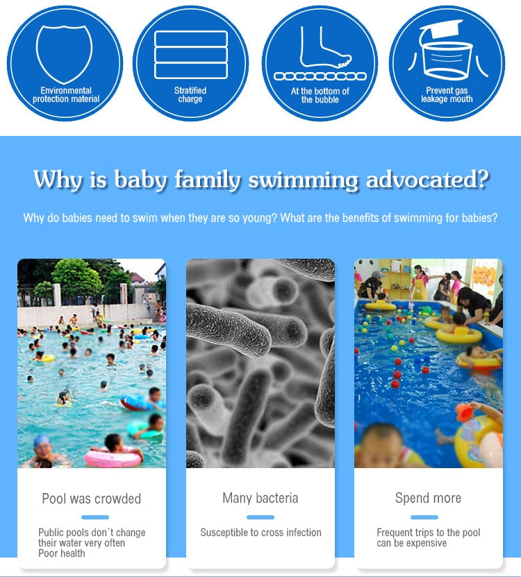 Het zwembad is gemaakt van duurzaam en milieuvriendelijk PVC-materiaal, dat zorgt voor stevigheid en langdurig gebruik. Het opblaasbare ontwerp maakt het gemakkelijk op te zetten en op te bergen, waardoor het ideaal is voor zowel binnen- als buitengebruik.
