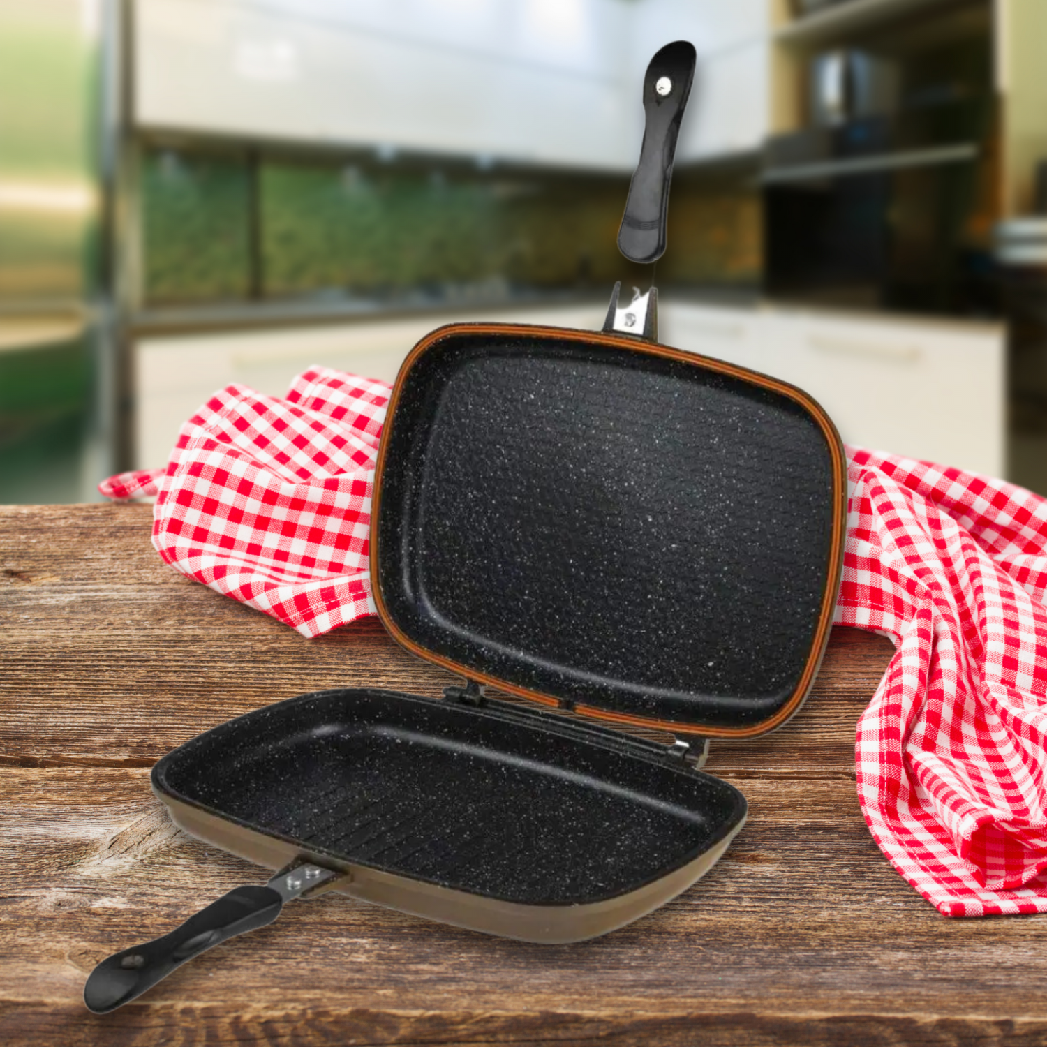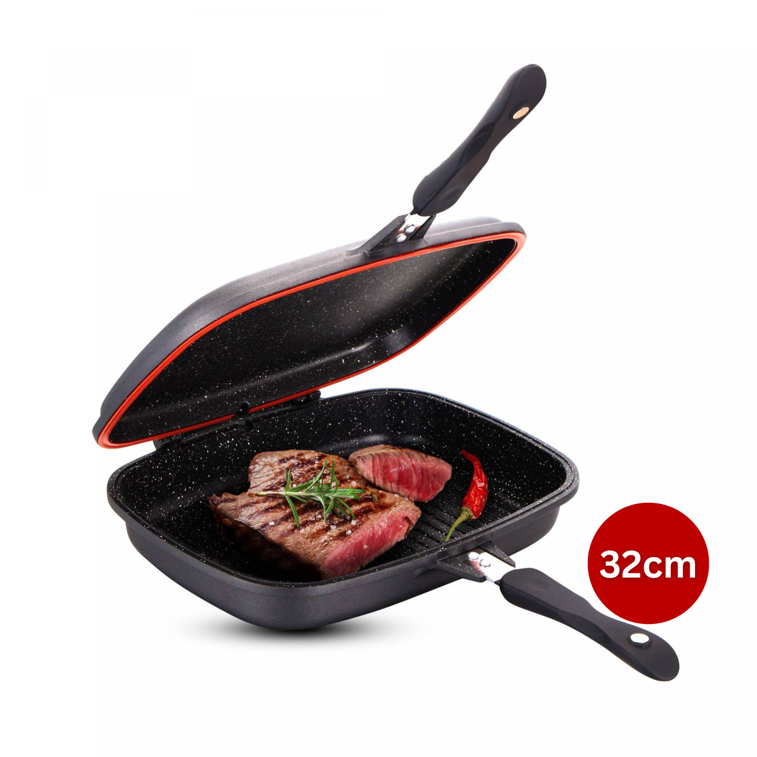 - Veelzijdig omkeerbaar ontwerp: De Cheffinger CF-DG32 is een dubbele koekenpan van 32 cm die een unieke omkeerbare functie biedt en zowel als braadpan als grillpan kan dienen. Of je nu eieren wilt bakken, groenten wilt sauteren of sappige steaks wilt grillen, deze pan heeft alles dankzij de handige dubbele functionaliteit.