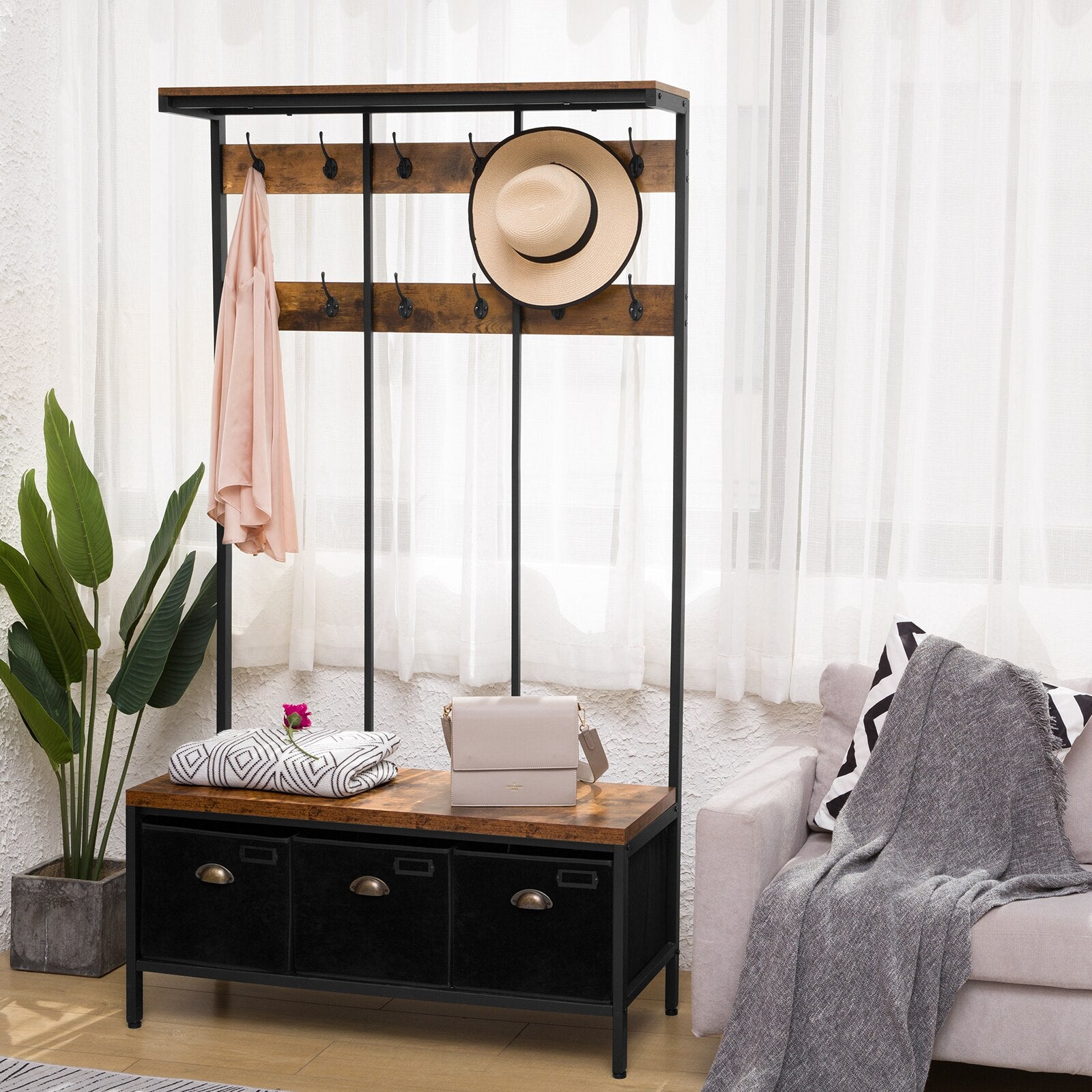 De HOOBRO Kapstok is een veelzijdig en functioneel meubelstuk dat perfect is voor de gang of de woonkamer. Deze kapstok is voorzien van 12 haken, waardoor je voldoende ruimte hebt om jassen, hoeden, tassen en andere accessoires op te hangen. Daarnaast beschikt het over een handige bank en schoenenopslag, evenals 3 opbergdozen voor extra opbergruimte.