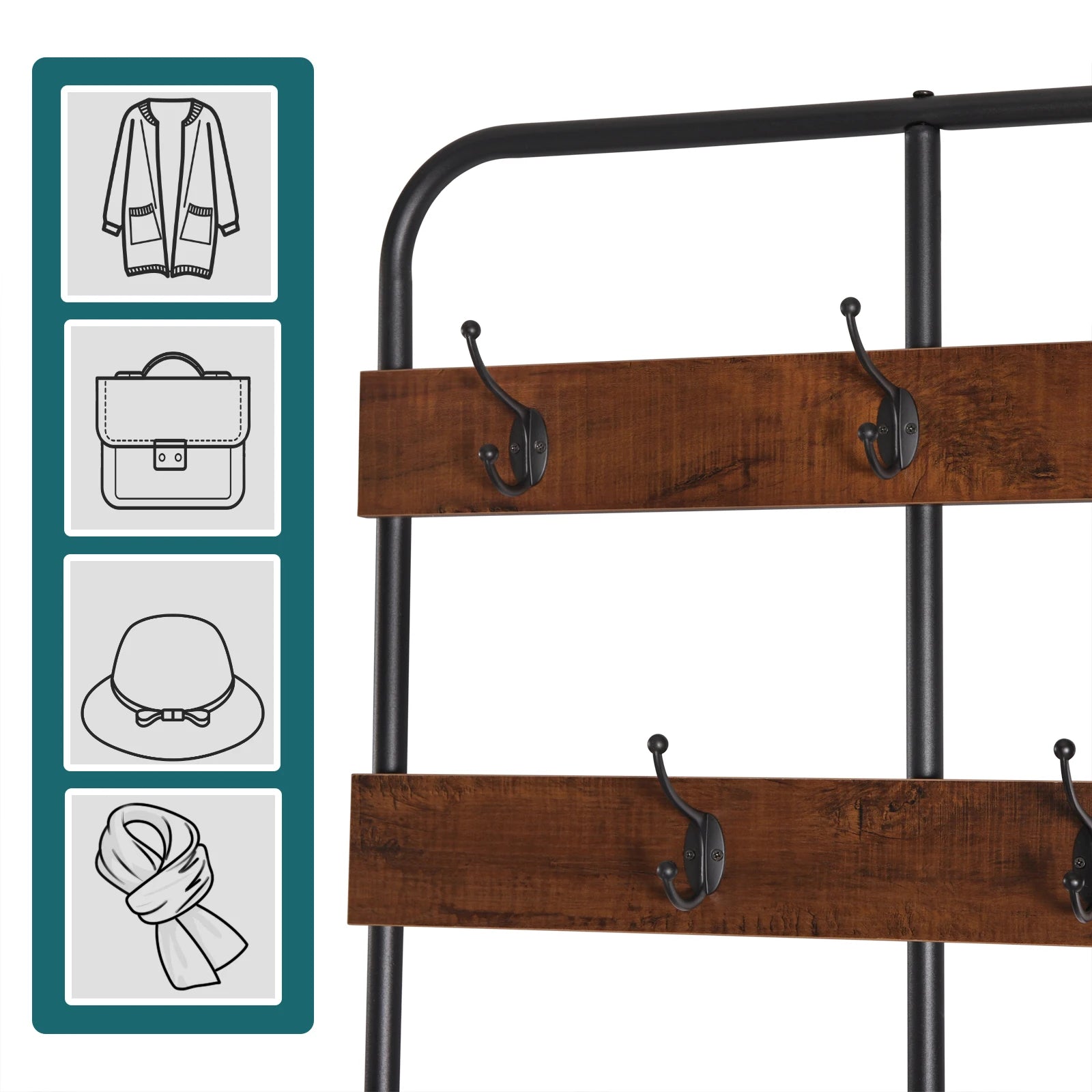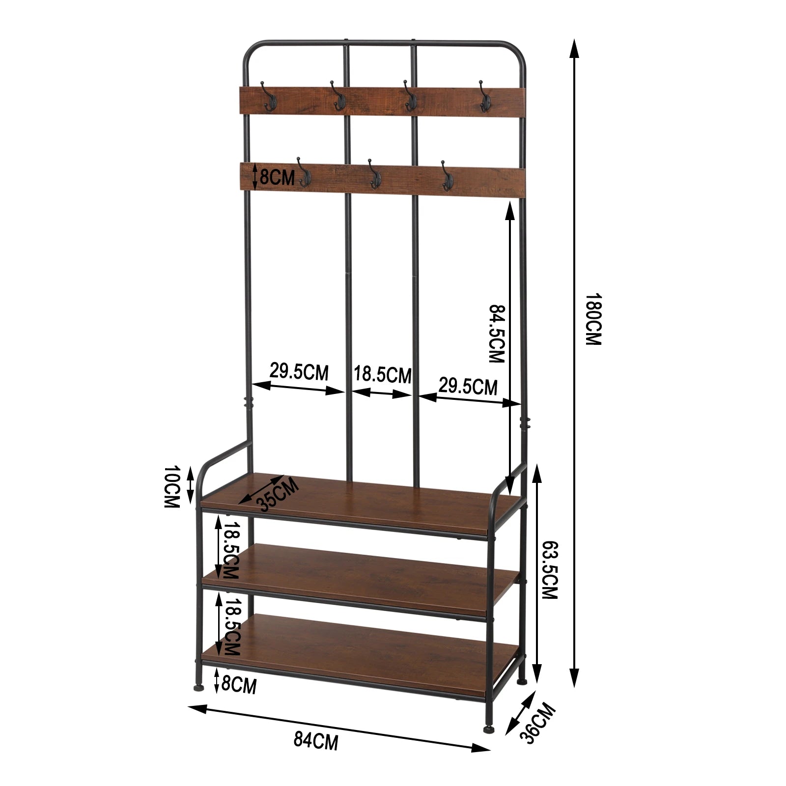 Organiseer je entree met deze stijlvolle en functionele Industriële Kapstok. Met een combinatie van een kapstok, schoenenrek en staande plank biedt dit meubelstuk voldoende opbergruimte voor jassen, sjaals, schoenen en meer. De kapstok is voorzien van 7 stevige haken, terwijl het schoenenrek en de plank gemaakt zijn van hoogwaardig MDF en metaal, waardoor ze duurzaam en stabiel zijn. De moderne stijl past perfect bij elk interieur, terwijl de donker beuken en zwarte kleuren een eigentijdse uitstraling geven. Met een totale afmeting van 84 x 180 x 36 cm (B x H x D) past deze kapstok perfect in de meeste gangen of entrees. Optimaliseer de opbergruimte in je huis met deze veelzijdige en praktische kapstok.