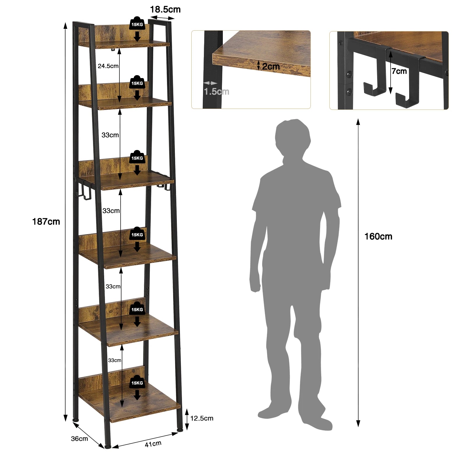 Voeg een vleugje industriële stijl toe aan je huis met deze prachtige boekenplank. Met een afmeting van 41x187x36cm biedt deze boekenkast voldoende ruimte voor al je favoriete boeken, decoratieve items en meer. De 6-laags structuur zorgt voor georganiseerde opslag, terwijl de 4 haken handig zijn voor het ophangen van sleutels, tassen of jassen. Gemaakt van hoogwaardig hout en met een robuuste metalen constructie, is deze opbergplank duurzaam en stabiel. Perfect voor gebruik in de woonkamer, keuken of zelfs in de hal om een stijlvolle en functionele displayruimte te creëren. Upgrade je interieur met deze veelzijdige boekenkast.