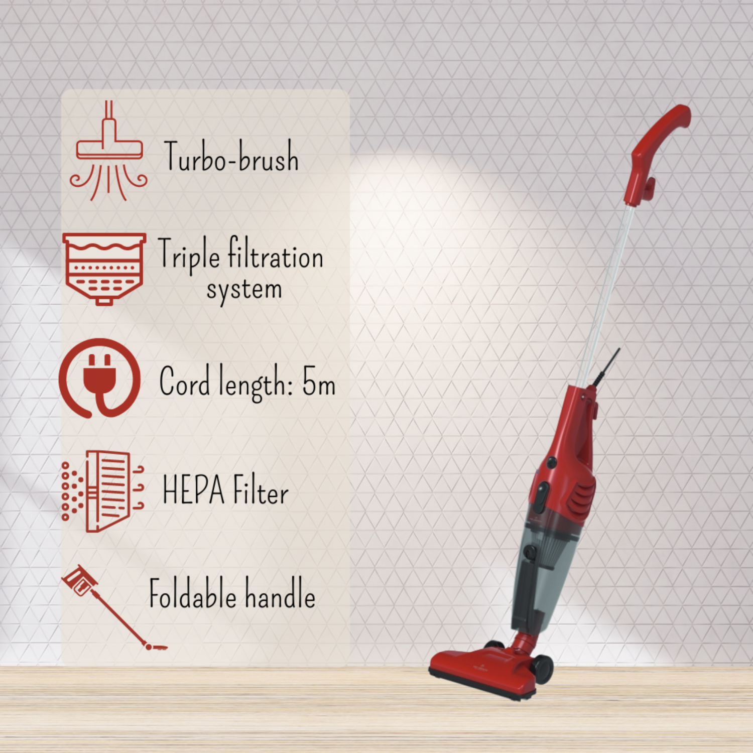 Met de krachtige motor van 600 W, geen stof, kruimel of vuil is niet te overwinnen voor de Just Perfecto stofzuiger, zodat u kunt genieten van een fris ruikend en schoon huis.