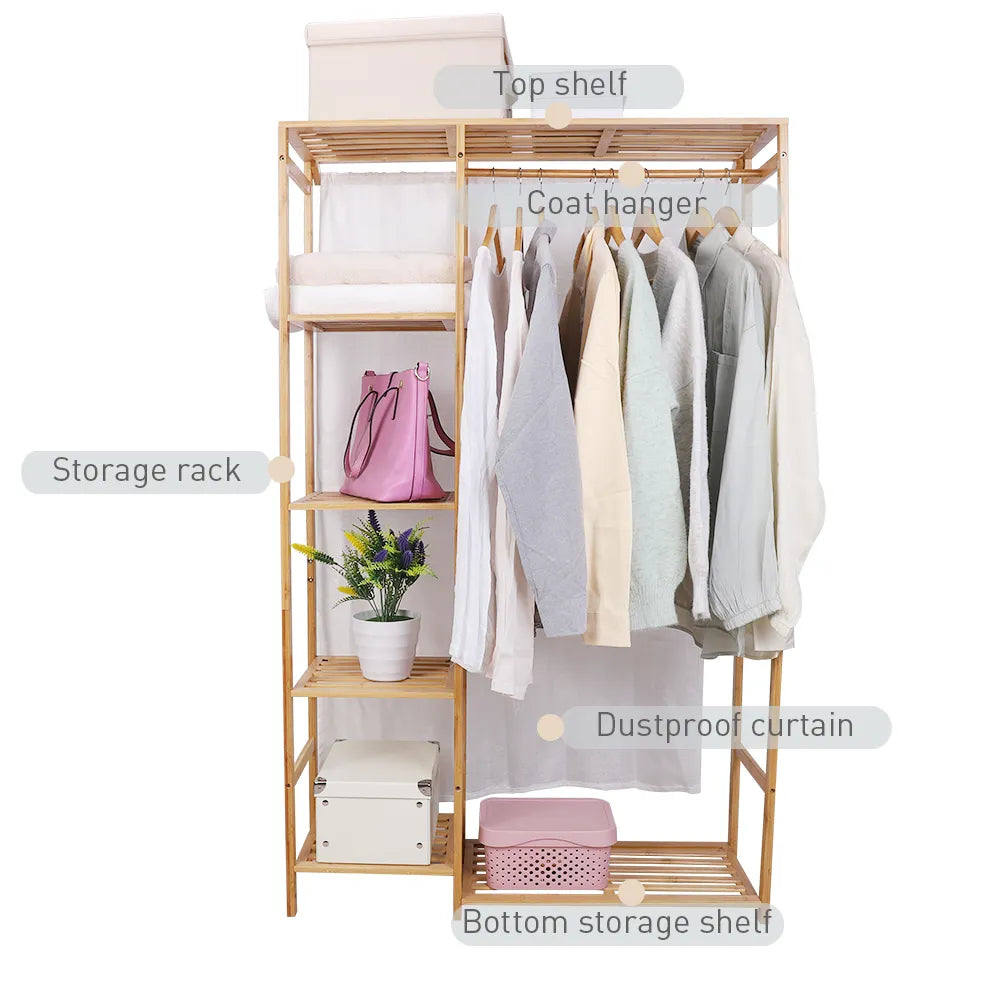 Dit bamboe kledingrek met planken is de perfecte toevoeging aan elke slaapkamer of hal, en biedt een stijlvolle en functionele opbergoplossing voor kleding, schoenen en jassen. Het rek is geschikt voor zowel kinderen als volwassenen en is ontworpen met duurzaamheid en esthetiek in gedachten. De stevige constructie biedt voldoende ruimte om kleding op te hangen, terwijl de handige planken extra opslagruimte bieden voor schoenen, accessoires en andere benodigdheden. Met dit kledingrek houd je jouw ruimte georganiseerd en overzichtelijk, terwijl je tegelijkertijd een vleugje natuurlijke elegantie toevoegt aan je interieur. Maak een einde aan rommelige kledingkasten en kies voor dit veelzijdige bamboe kledingrek voor een opgeruimde en georganiseerde leefruimte.