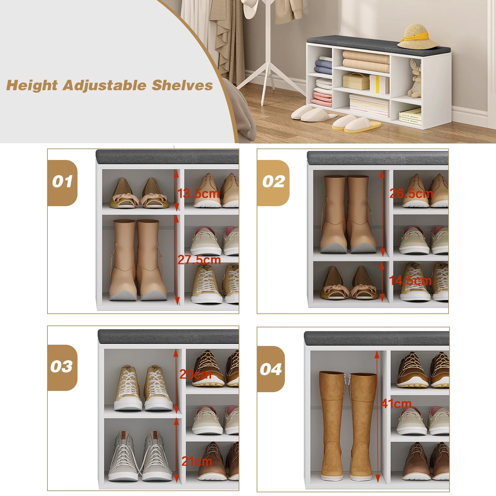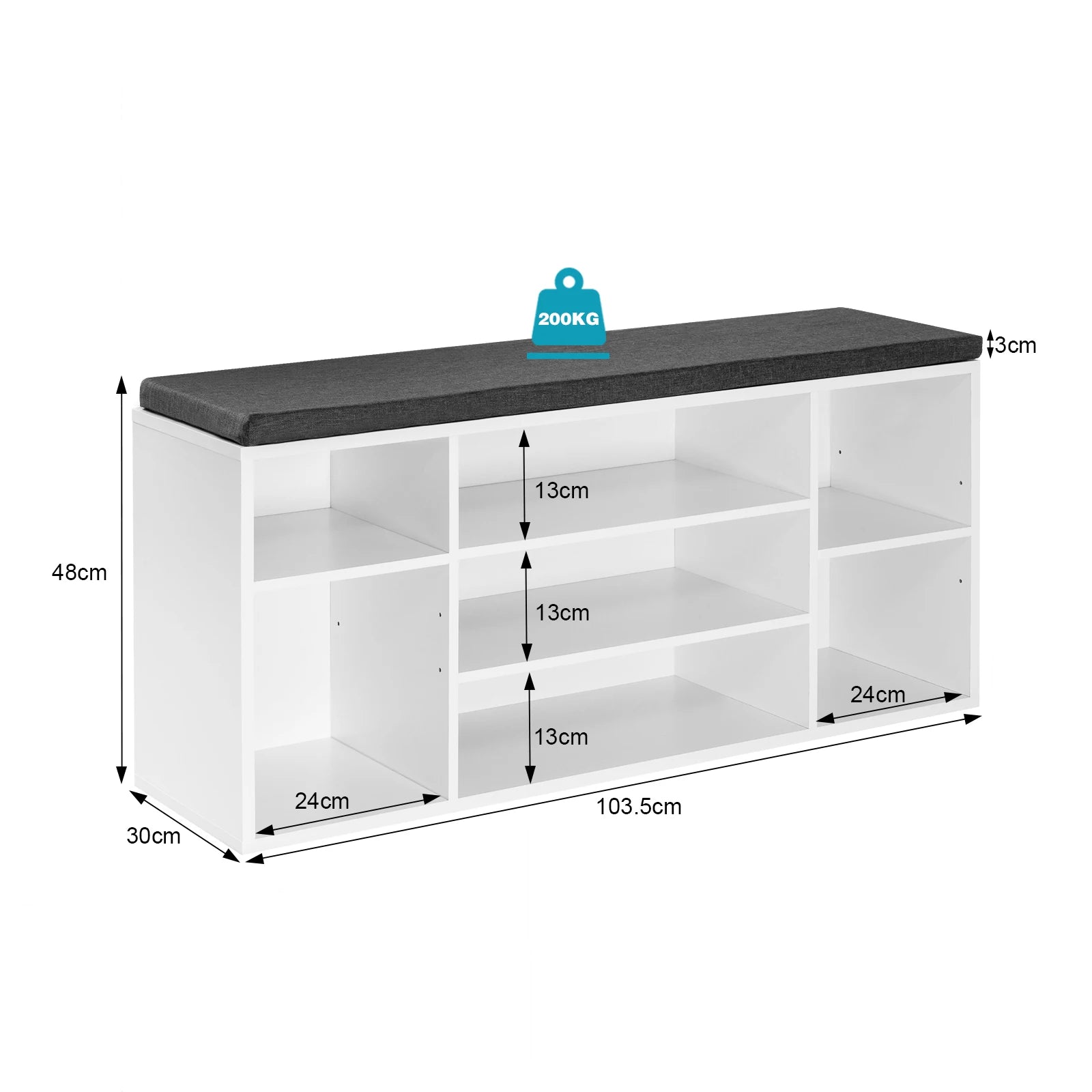 Houd je hal georganiseerd en stijlvol met deze moderne schoenenkast. Met een afmeting van 103,5x30x48cm biedt deze vrijstaande witte spaanplaat plank voldoende ruimte om schoenen op te bergen. De kast is voorzien van 7 compartimenten, perfect om al je schoeisel netjes te ordenen. Bovendien wordt het geleverd met een comfortabel grijs stoffen kussen, waardoor het niet alleen een praktische oplossing is voor het opbergen van schoenen, maar ook een handige zit plek om je schoenen aan te trekken. Deze schoenen opbergbank combineert functionaliteit met een eigentijds ontwerp, waardoor het een essentiële toevoeging is aan elke entree of hal.