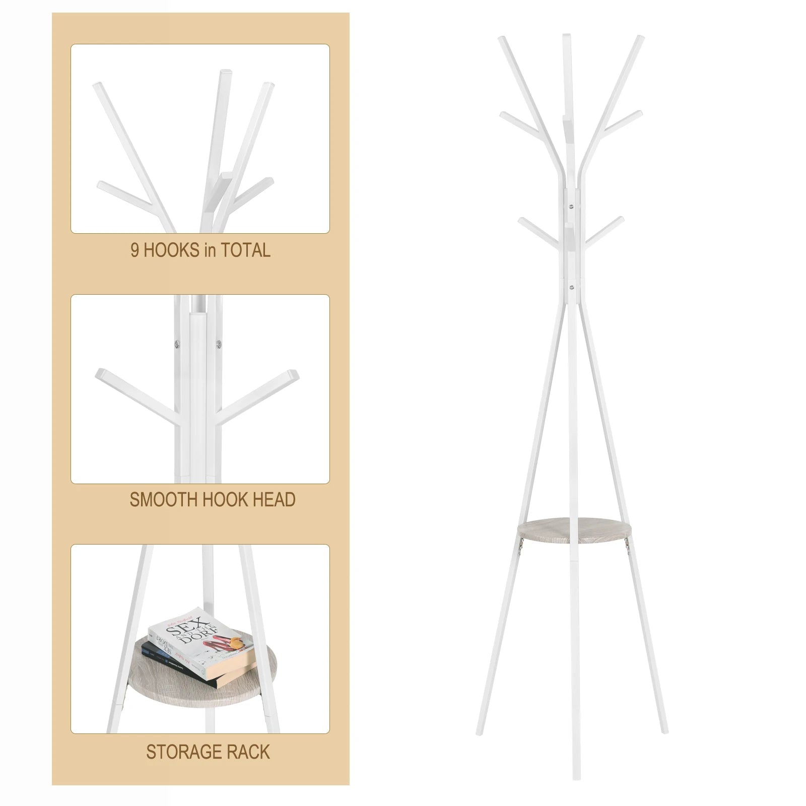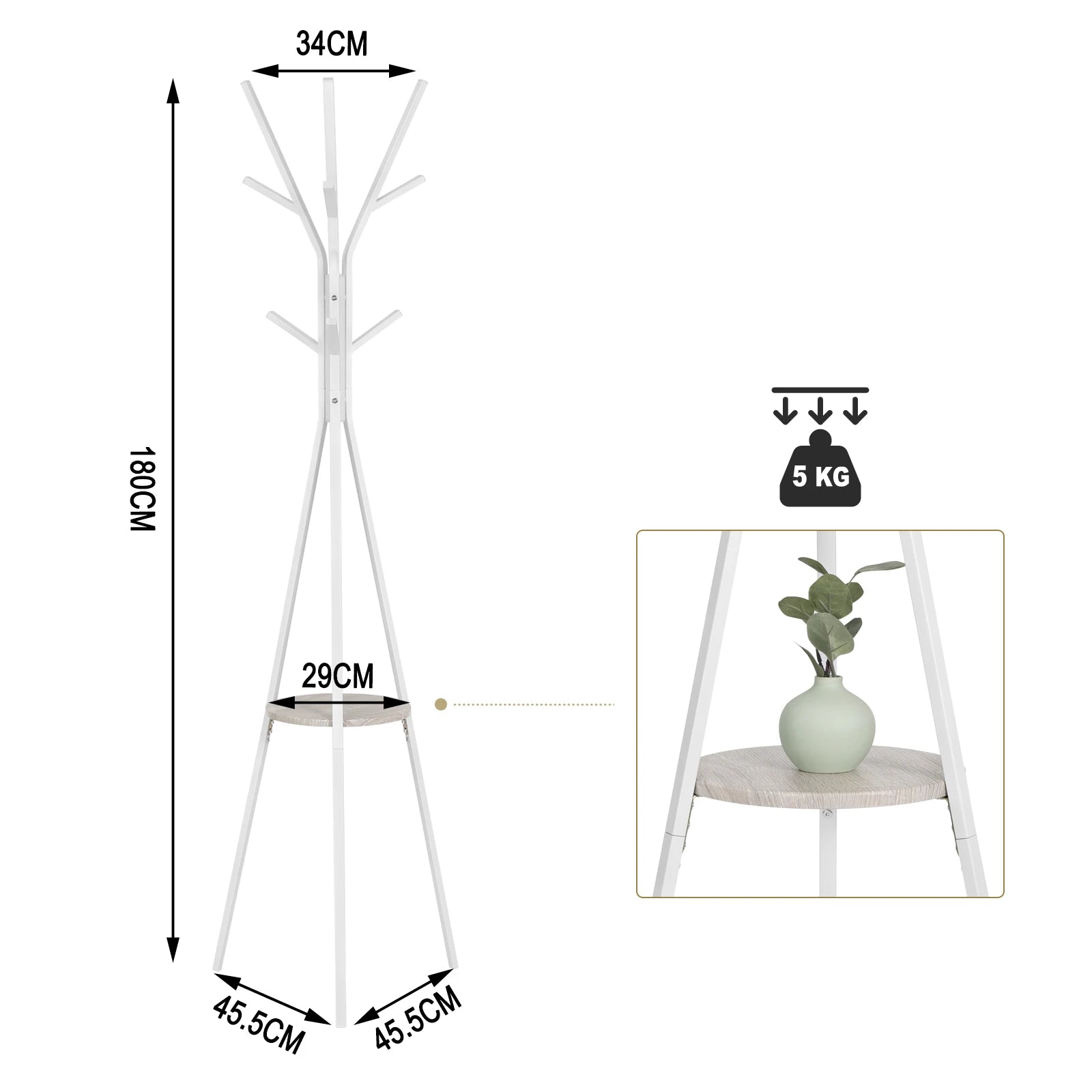 Voeg functionaliteit en stijl toe aan de entree of gang van uw huis met deze staande kapstok. Gemaakt van stevig wit metaal, biedt deze kapstok met plank en 9 haken voldoende ruimte voor het ophangen van kleding, hoeden, sjaals en tassen. Het moderne ontwerp past perfect bij elk interieur en zorgt voor een opgeruimde en georganiseerde entree.