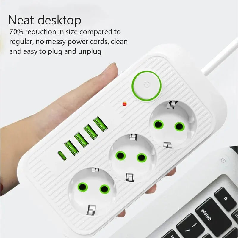 Deze handige EU stopcontactdoos met een 2 meter verlengsnoer biedt niet alleen 3 AC-uitgangen, maar ook 4 USB-poorten en 1 Type C-poort voor het opladen van al je apparaten. Dankzij de netwerkfilter is je apparatuur beschermd tegen storingen en stroompieken. De stopcontactdoos is ideaal voor zowel thuis als op kantoor en ondersteunt snel opladen voor je smartphones, tablets en andere apparaten. Met een compact ontwerp en gebruiksvriendelijke functies is deze verlengsnoer een must-have voor jouw elektronische apparatuur.