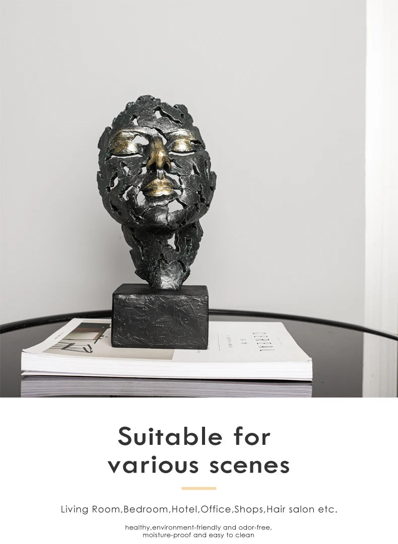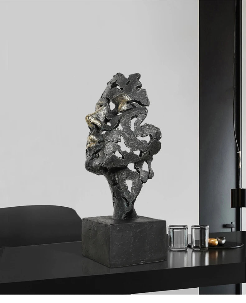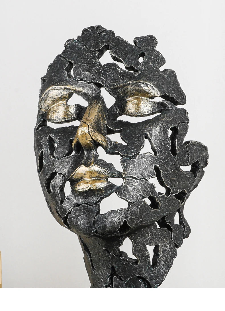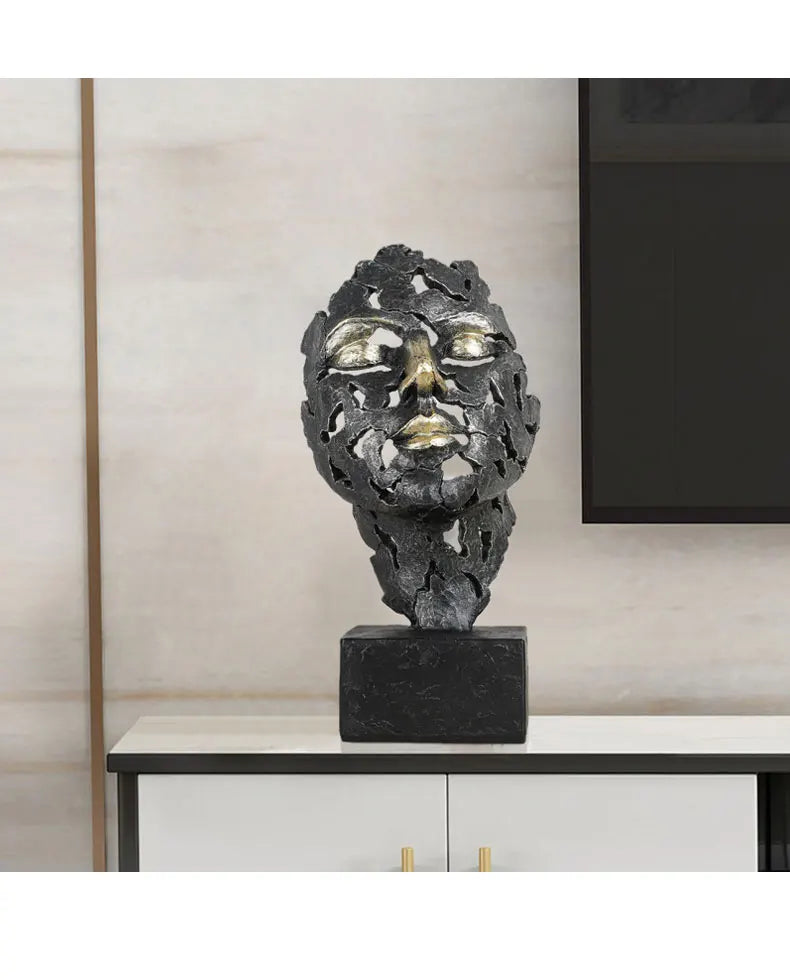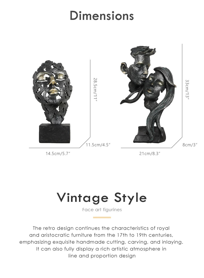 Voeg een vleugje elegantie en mysterie toe aan je interieur met deze prachtige vintage gezichtsbeeld-sculptuur. Deze unieke decoratie, uitgevoerd in een stijlvolle combinatie van zwart en goud, stelt een artistiek kusmasker voor en is perfect voor het decoreren van elke ruimte, van moderne woningen tot klassieke villa's of knusse cottages. Het retro design straalt verfijning uit en fungeert als een echte blikvanger in je woonkamer, slaapkamer of entree.